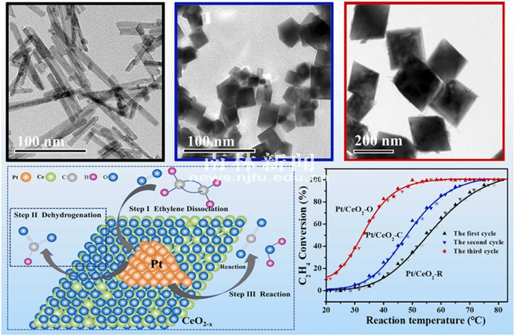 Recently, Wei Haiying, a PhD Candidate of the College of Light Industry and Food Science NJFU, has published a paper entitled " Morphological effect of ceria-supported platinum catalyst on low-temperature ethylene oxidation” in the top international journal ‘Applied Catalysis B: Environment’ (link: https://doi.org/10.1016/j.apcatb.2022.122242). Nanjing Forestry University was the first completion unit. Wei Haiying was the first author. Prof. Xiao Huining, Associate Professor Li Licheng of the College of Chemical Engineering NJFU and Zhang Tingwei, a PhD candidate of the College of Light Industry and Food Science NJFU were the corresponding authors. The achievement was co-funded by Nanjing Forestry University, the National Natural Science Foundation of China, and Jiangsu Province.