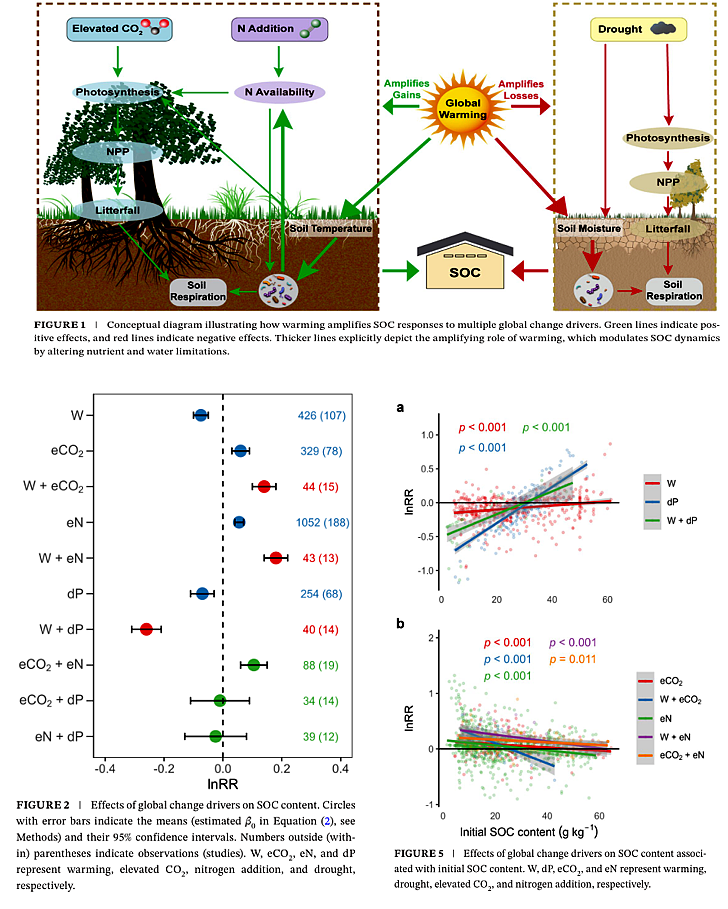 Recently, based on the research of Professor Ruan Honghua's team of the College of Ecology and Environment, a paper entitled " Warming Amplifies Responses of Soil Organic Carbon to Multiple Global Change Drivers” has been published in the top international journal ‘Global Change Biology’ (https://doi.org/10.1111/gcb.70612). NJFU was the first completion unit. Lecturer Sun Yuan of the College of Ecology and Environment was the first author. Professor Ruan Honghua, Professor Han Y. H. Chen and Professor Manuel Delgado-Baquerizo were the co-corresponding authors. This research was funded by the National Key Research and Development Program of China and the Jiangsu Provincial Natural Science Foundation for Young Scholars.
